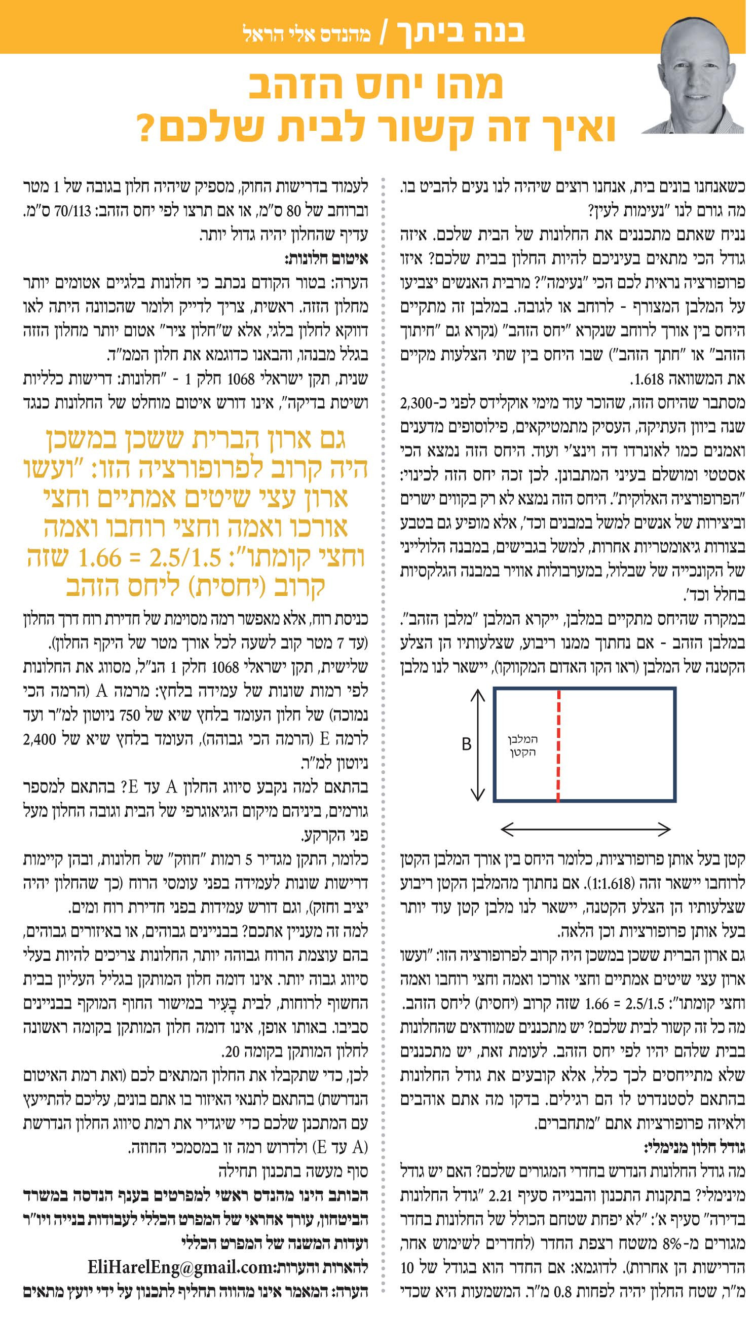 מה כל זה קשור לבית שלכם? יש מתכננים שמראש הפרופורציות של החלונות בבית שלהם הוא לפי יחס הזהב. לעומת זאת, יש מתכננים שלא מתיחסים לכך כלל, אלא קובעים את גודל החלונות בהתאם לסטנדרט לו הם רגילים. בדקו מה אתם אוהבים ולאיזה פרופורציות אתם "מתחברים" ובקשו מהמתכנן שלכם, אם אין מניעה, שיבצע בהתאם.