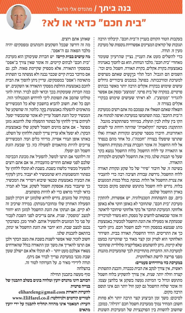 בעקבות הטור הקודם בעניין ה"בית חכם",קיבלתי הרבה תגובות של קוראים המציינים אפשרויות נוספות של מערכת מעין זו. תודה.
