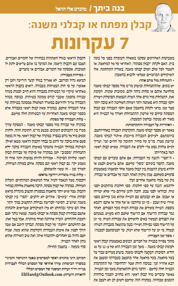 הערה אחרונה ואולי מיותרת, אבל בכל זאת: אם החלטתם "ללכת" על קבלן מפתח, תבדקו היטב אם שמו הולך לפניו, איכות עבודות קודמות שהוא עשה, שנוח לכם (והיה גם לאחרים) להתנהל איתו ושירות שהוא נותן לאחר הבנייה.