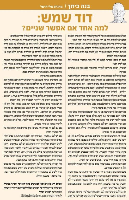 בהרחבה של הישוב בו אני גר, בכל הבתים מותקן דוד שמש אחד בלבד. רובם בנפח של 150 ליטר. מילא, כאשר קונים דירה מקבלן, אפשר להבין שיש דוד שמש אחד בלבד, אבל אם אתם מתכננים את הבית בעצמכם, ויש לכם משפחה גדולה מעל הממוצע (מ-6 נפשות ומעלה), או שאתם מתכננים להיות משפחה גדולה, האם שאלתם את עצמכם אם זה מספיק?