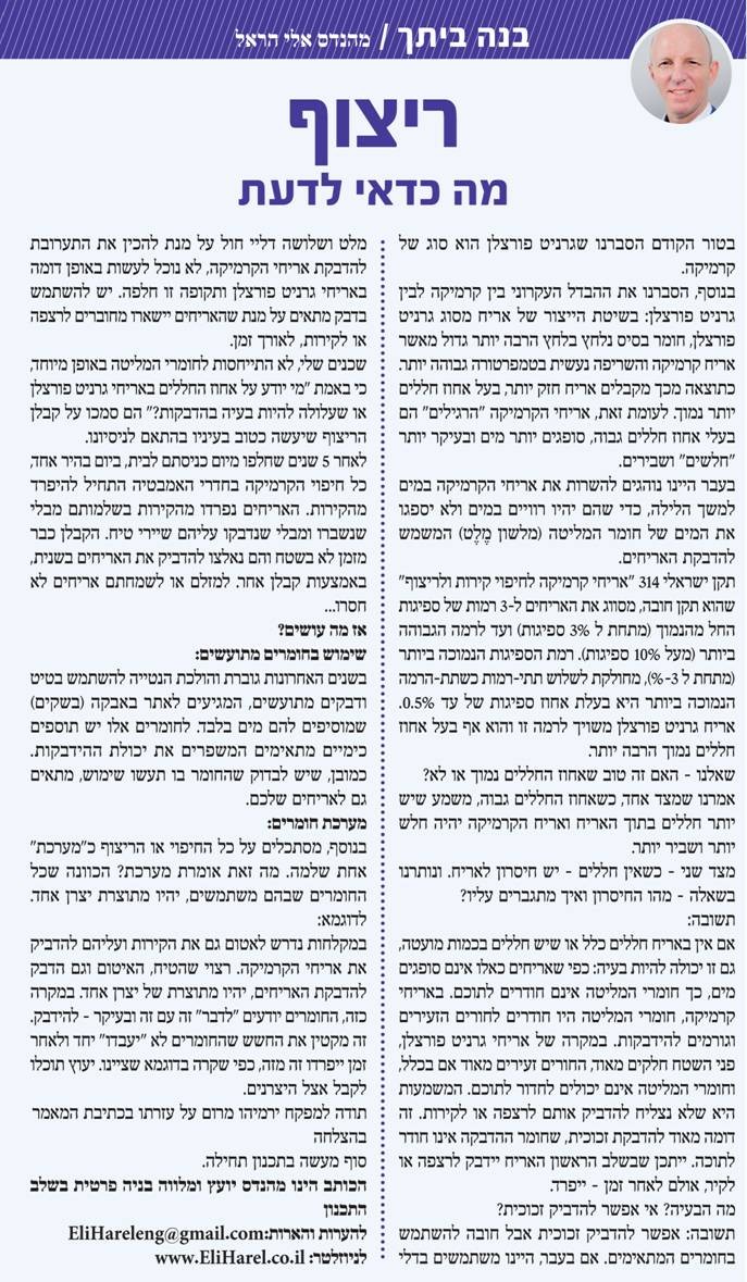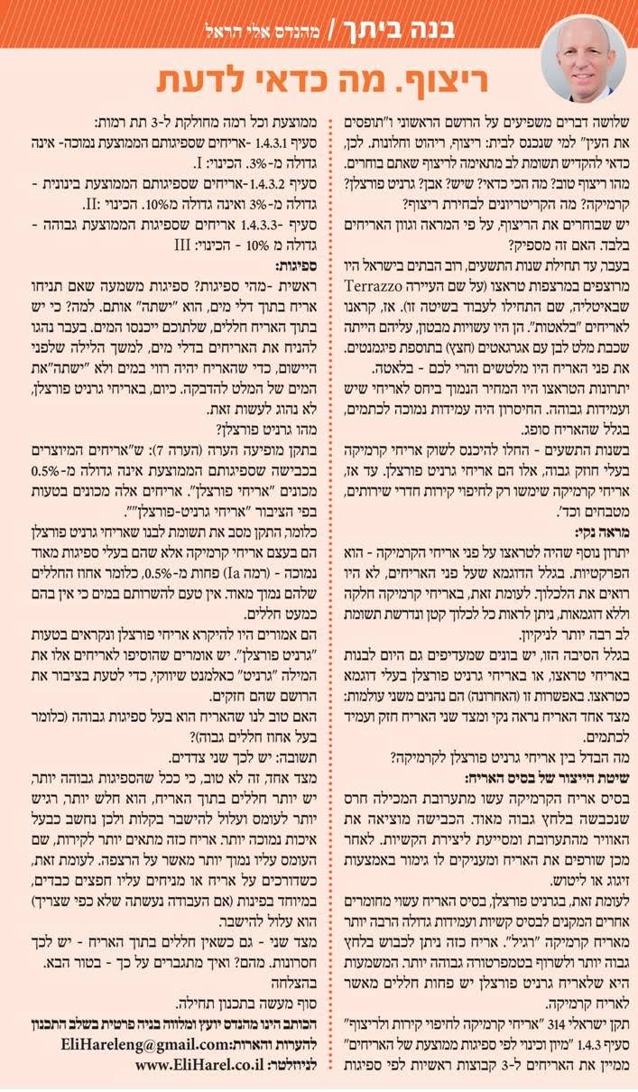 שכנים שלי, לא התייחסות לחומרי המליטה באופן מיוחד, כי "מי יודע על אחוז החללים באריחי גרניט פרוצלן או שעלולה להיות בעיית ההתדבקות?" הם סמכו על קבלן הריצוף שיעשה כטוב בעיניו בהתאם לניסיונו.